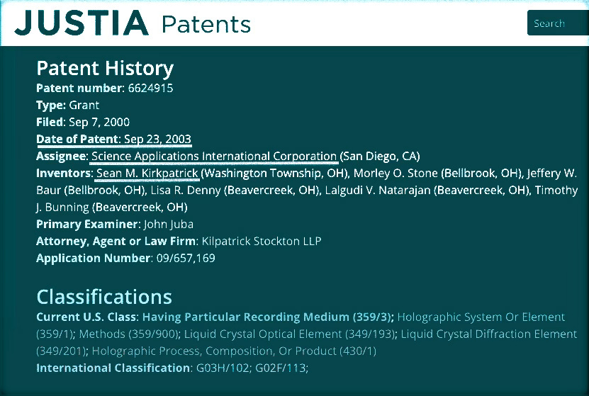 Patent US6624915B1 filed on 9/7/2000 under SAIC, and listing Kirkpatrick as an inventor, was for "Holographic recording and micro/nanofabrication via ultrafast holographic two-photon induced photopolymerization (H-TPIP)." In short, this invention provides an improved process for nano-fabrication and holographic recording that includes applications for genome sequencing: